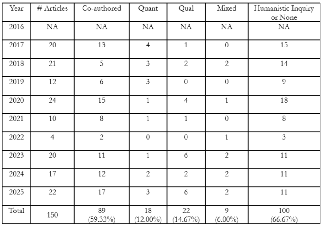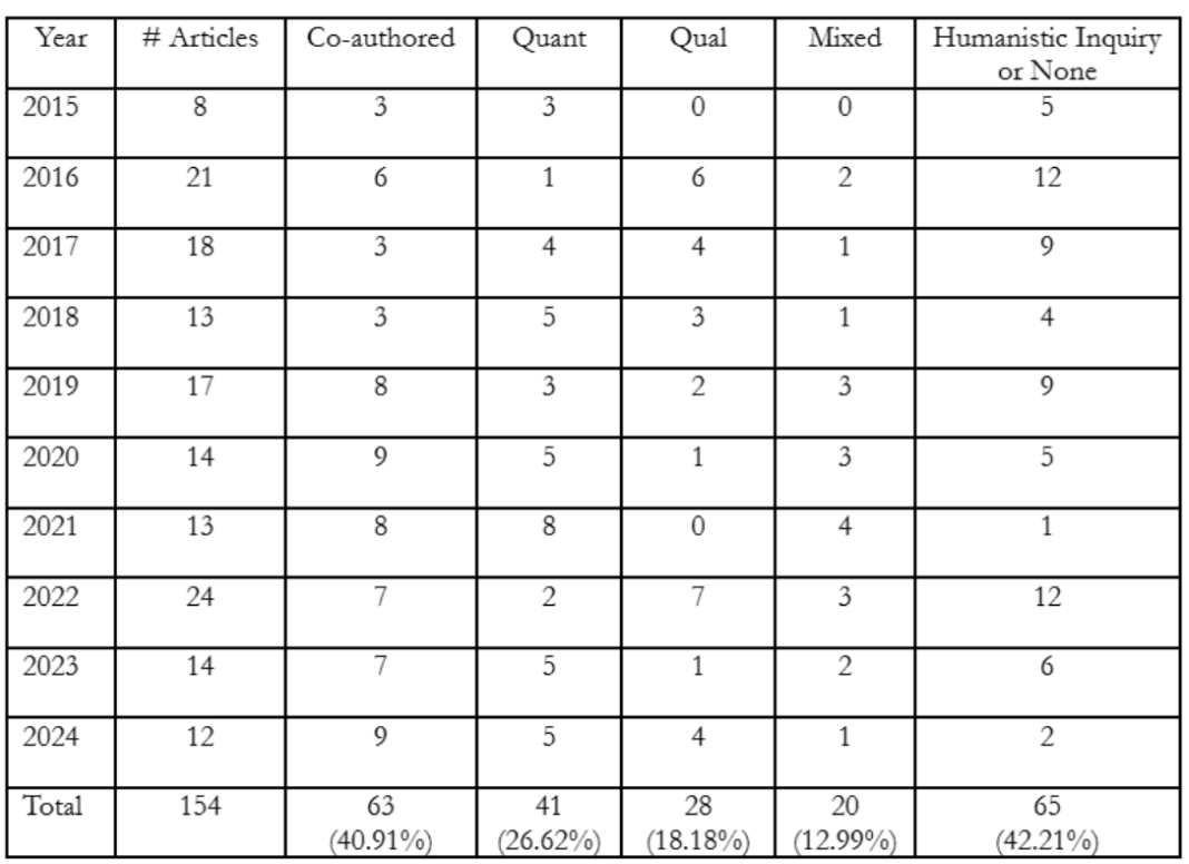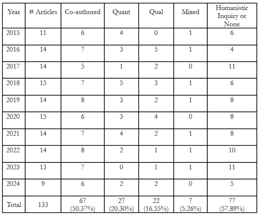 There were fewer co-authored articles (40.91%) than articles published by a solo author (59.09%). Among the published articles, 57.79% utilized social sciences research methods while 42.21% did not utilize any research methods or drew on humanistic inquiry. In total, 39.61% drew on quantitative methods while 31.17% drew on qualitative methods. The number of articles published, and the preferred methods, differed each year without a discernible pattern.