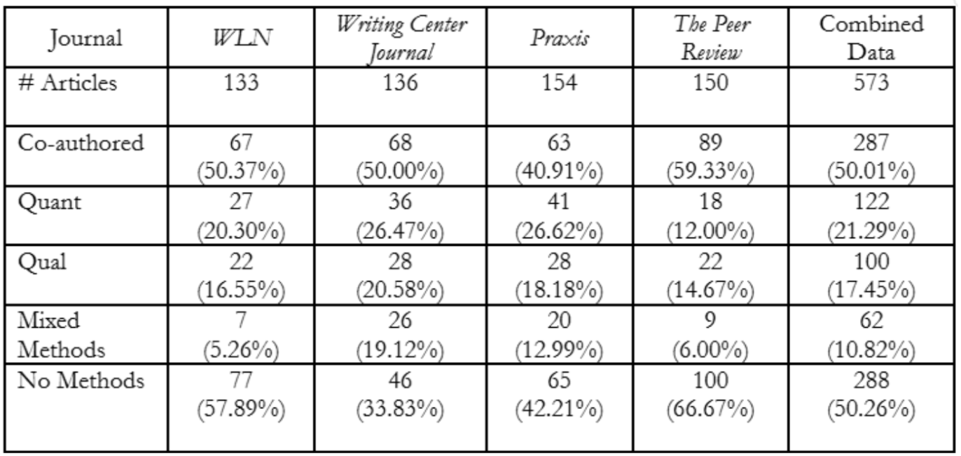 In this work, I make a distinction between research that follows more closely social sciences research versus humanistic inquiry. When reviewing the methods employed by the studies, it was important to consider the intentionality of the author’s use of research methods. Oftentimes, author(s) would use narrative and personal experience, which would not be categorized as a social sciences research method for the purposes of this work. For example, Paula Rawlins and Amanda Arp’s (2023) WLN article “Taking Up Space and Time: How Writing Center Administrators Can Better Support Fat (and All) Tutors” draws on personal narrative but does not frame their work as research or as autoethnographic; therefore, it is not categorized as drawing on a social sciences research method. Meanwhile, some do not state a method in the title, nor do they contain a traditionally titled methods section, like Bethany Mannon’s (2016) “What do Graduate Students want from the Writing Center? Tutoring Practices to Support Dissertation and Thesis Writers.” Further investigation found that the author used both surveys and interviews of graduate students in their work, the research was IRB approved, and the author discussed their methods; therefore, this article was considered a mixed-methods study in social sciences research.