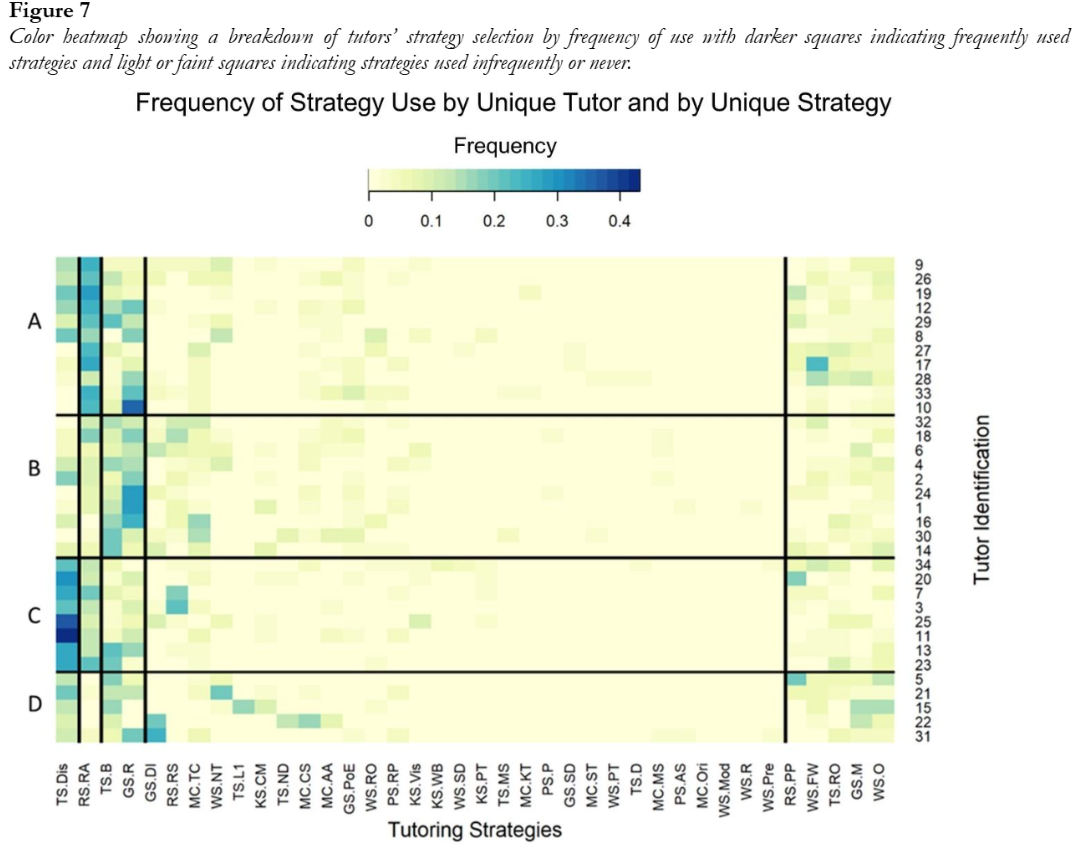 The key components of the heatmap include the individual squares that comprise the map, as well as the labeling along the bottom edge. The letters along the bottom of the heatmap denote the 37 most frequently used strategies, all of which tutors were trained to use. Starting from the bottom left, we see “TS.Dis,” which was the researchers’ shorthand for “Talking Strategy, Discussion.” In this format, “Talking Strategy” refers to the “family” code—a related group of activities that individual strategies were coded under—while “Discussion” is the individual strategy that tutors reported utilizing. Likewise, the rightmost label, “WS.O,” stands for “Writing Strategy, Outline,” again indicating both the “family” of activities (writing strategies) and the individual strategy (outlining). See Appendix B for the full list of strategy groupings and acronyms.