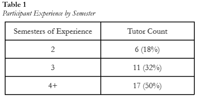 We randomly selected notes from 34 undergraduate and graduate tutors from a larger pool of 78 tutors. Tutors had at least 2 semesters of experience, with a range of 2–6 semesters (Table 1). Semesters of experience were roughly even between undergraduate (~3) and graduate tutors (~3.2).