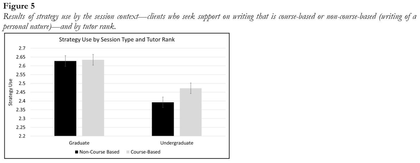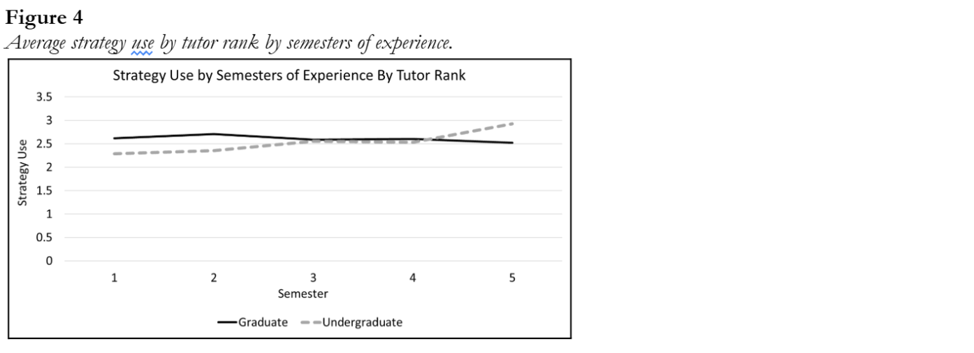 The differences in tutoring practices between undergraduate and graduate tutors (Fig. 8) beg the question of whether variation in strategy usage is synonymous with flexibility. Whereas graduate tutors remained largely consistent in this element of their tutoring practice throughout their tenure, undergraduate tutors had significant change in the average number of activities that they utilized; by the third semester of employment, they moved in-line with graduate students’ activity use, and by the fifth semester they used roughly half a strategy more per session than their graduate tutor counterparts (2.9 and 2.5, respectively) (Fig. 4). The initial difference between these two group’s behaviors might be due to the different ways in which they were trained and recruited into the writing center (undergraduates through a course, graduates through a summer workshop). Yet, a previous study found that tutors—irrespective of rank—begin to coalesce in the ways they describe, evaluate, and reflect upon their tutoring sessions, which suggests that time, rather than rank, is an important driver of change (Giaimo and Turner, 2019). Considering our previous findings that undergraduate and graduate tutors utilized similar amounts of strategies after a few semesters of work, we believe that there is a cohort effect that takes place where tutors of different ranks and training backgrounds learned from each other and developed shared practices (irrespective of flexibility). One takeaway for WPAs and WCDs is that there are a lot of potential positive outcomes surrounding pedagogical development that arise from mixed rank tutor-educator training models.