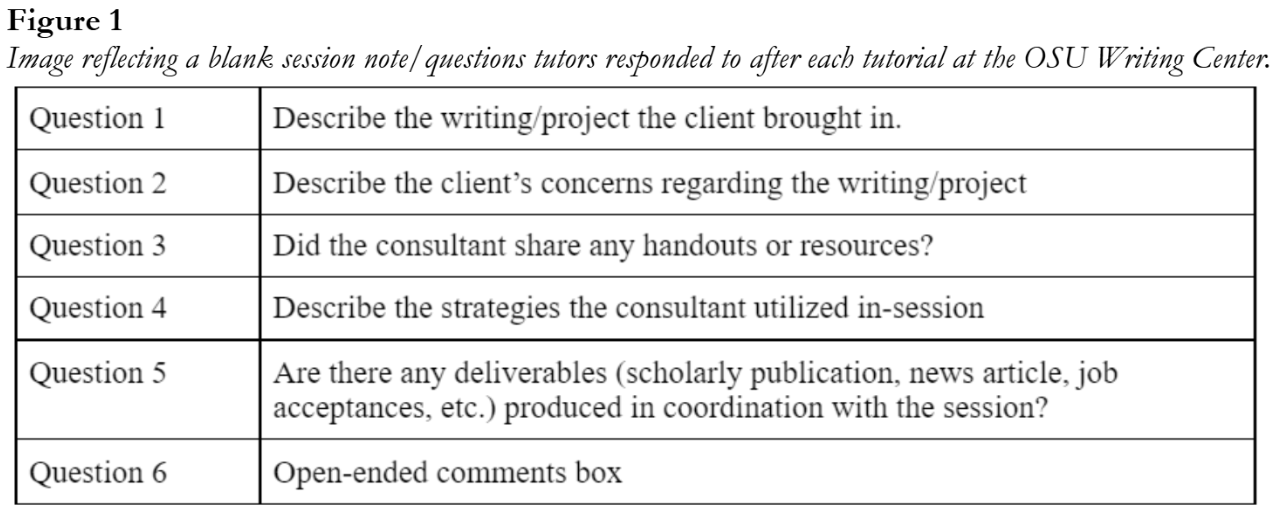 The current study began with an inquiry into how post-session reflective notes in writing centers can help us better understand how tutors professionally develop over time. The authors of this paper (then a new undergraduate tutor and writing center director) initially gave little thought to the common practice of filling out session notes. Unsure of what these forms were supposed to do rhetorically or pedagogically, we developed a longitudinal assessment that applied discourse analysis to session notes to trace how different cohorts of tutors reported engagement with their professionalization. From our analysis, we found that after a couple of semesters (and with intensive training), most tutors—undergraduate and graduate, alike—converged on similar behaviors in-session as well as similar note taking practices (Giaimo and Turner, 2019).