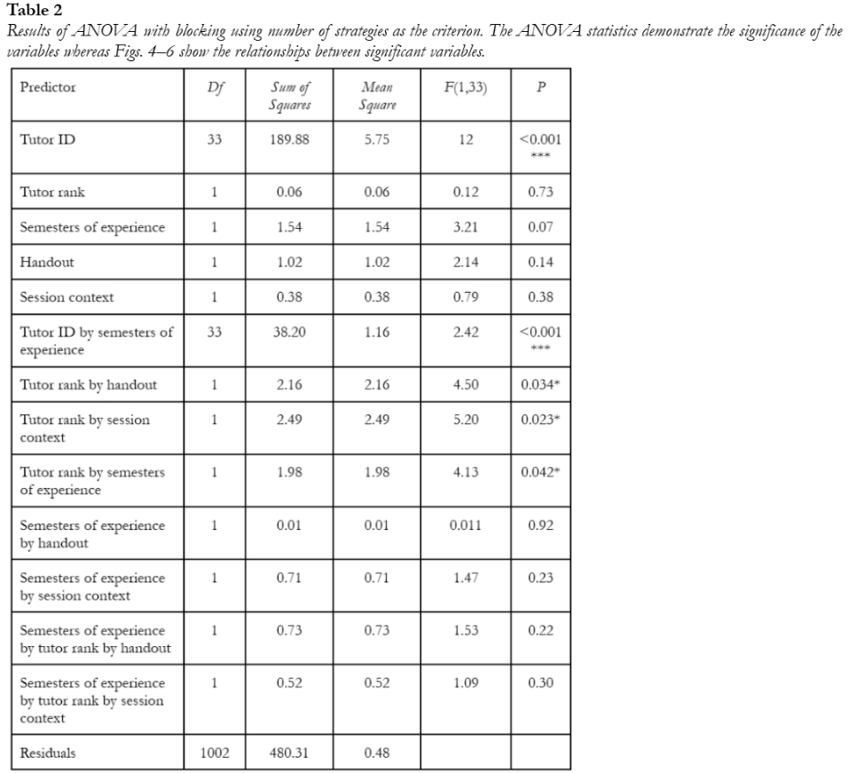 Analysis of variance (ANOVA), a set of statistical tests that compares group mean differences in an experimental dataset, was used to measure how different variables affect the number of strategies that tutors used per session. In this analysis, several variables were compared and the means that were significantly different (P value and F value) were identified (see Table 2) and interpreted (see Figures 4–6). Review this link for more details about ANOVA (analysis of variance) and F tests.